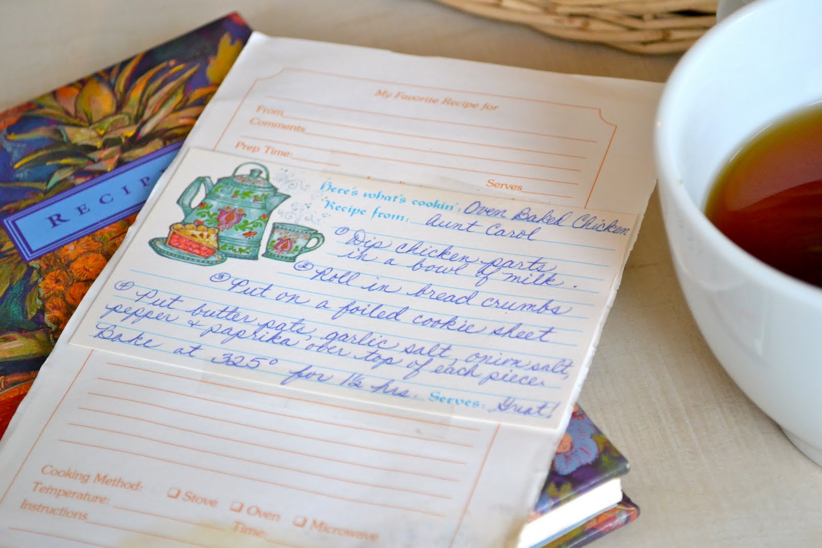 I found this recipe in my very first recipe book I started when I was probably in my late teens or early twenties. It was fun to look some of the magazine clippings I saved to see what inspired me back then and look at various recipe cards my mom wrote for me. I found Oven Baked Chicken from my mom that was a recipe my Aunt Carol must have given her. I remember when I was young and she would make this. I haven’t had it in years so I was anxious to make this again.