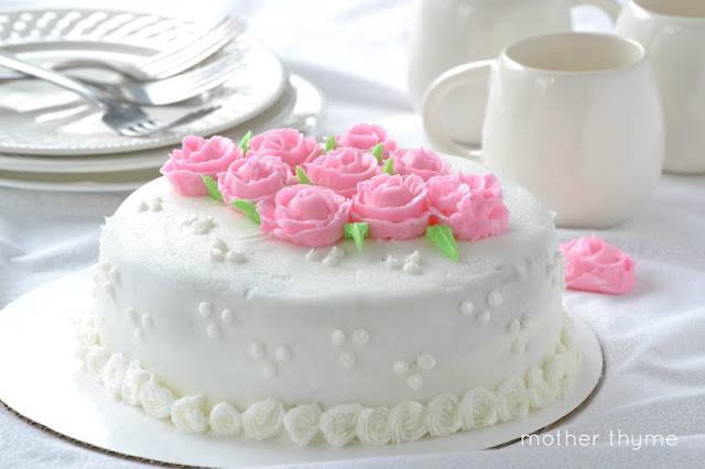 | Cake was made with 9 roses using tip 12 and tip 104; border was made as a rosette using tip 18; Â leaves were made using tip 352 and dots around cake were made with tip 18. |