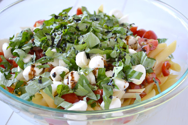You get all the components of a fresh Caprese salad tossed with pasta in a balsamic reduction and olive oil dressing.